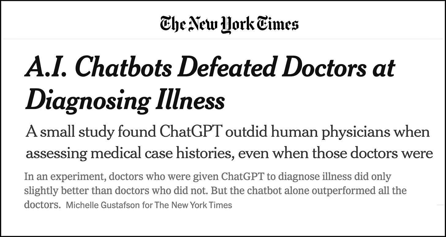 Dave: It turned out to be yet another hoax. Unfortunately, The New York Times ran with it, and the story spiraled out of control: https://sergeiai.substack.com/p/the-ai-outperforms-doctors-claim